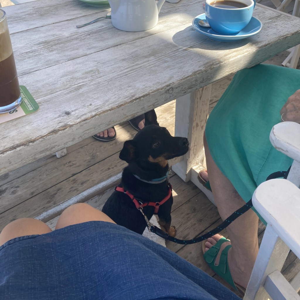 So to try and make me stops with the shouting, they takes me out as much as they can, which isn’t always that easy because the fing is, friends, Muvver and Farver don’t really like other humans that much. They just likes each other and family and a few humans, but for me they says “Let’s go out Ziggy Moonbeam and let you see other humans” and we goes and we does a sit in a restaurant or a pub or a cafe and they say “on your mat” and I sits under the table on my blanket and Muvver holds treats in her hand and when peoples does a walk near us she drops a treat so I eats it.